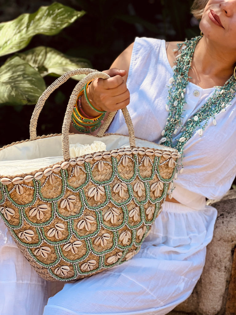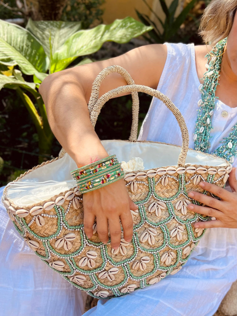 A different twist on the necessary bag: this one, made of delicately handwoven natural fibers,  gets extra points for originality.