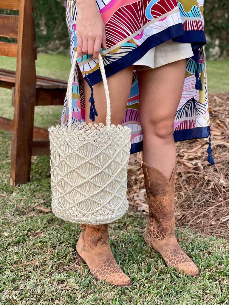 This extra detailed bag boasts a beautiful display of weaving in a delicate shell glisten tone.