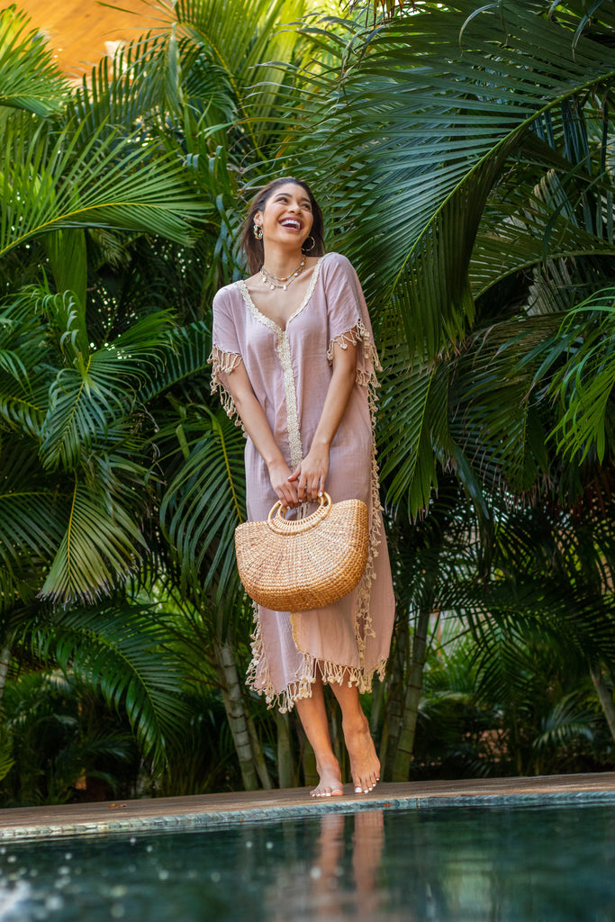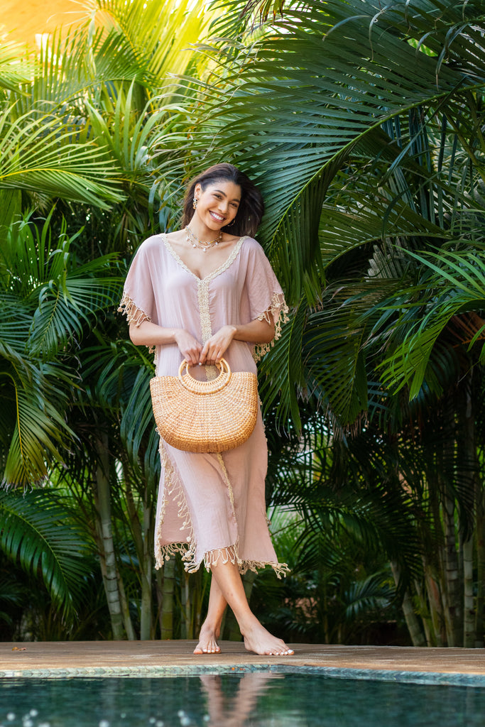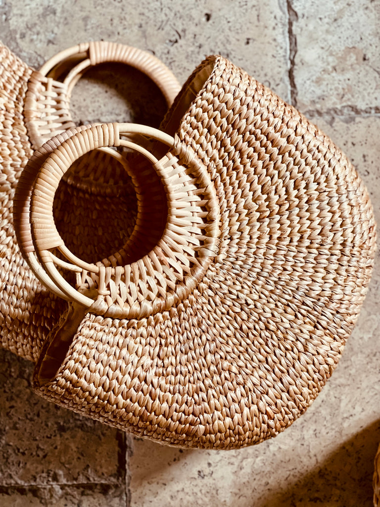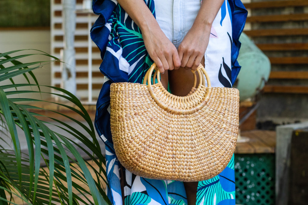 A different twist on the necessary bag: this one, made of delicately handwoven natural fibers,  gets extra points for originality.