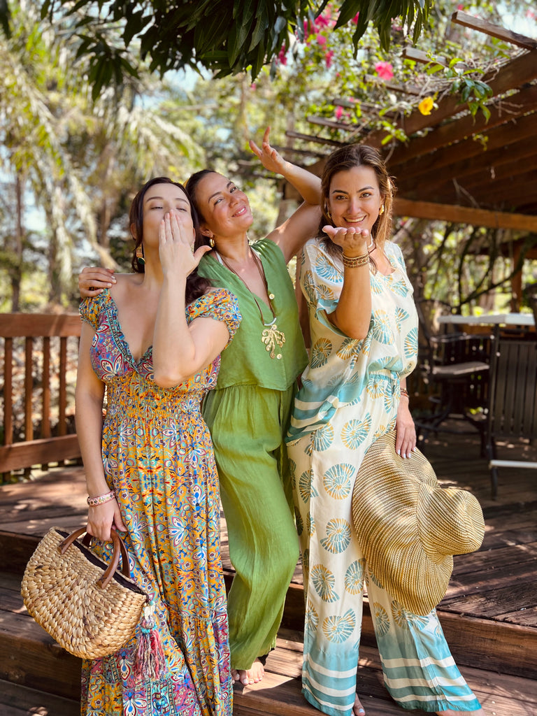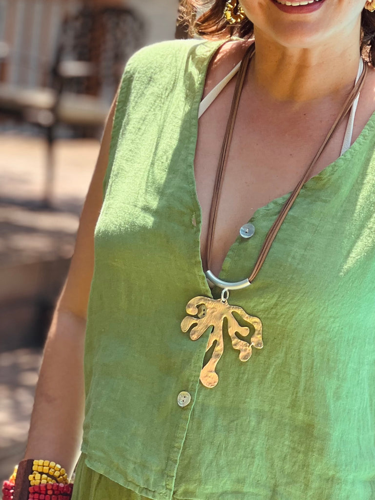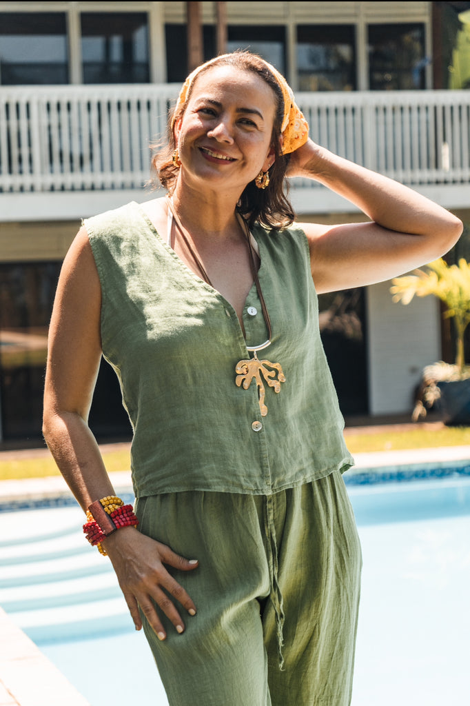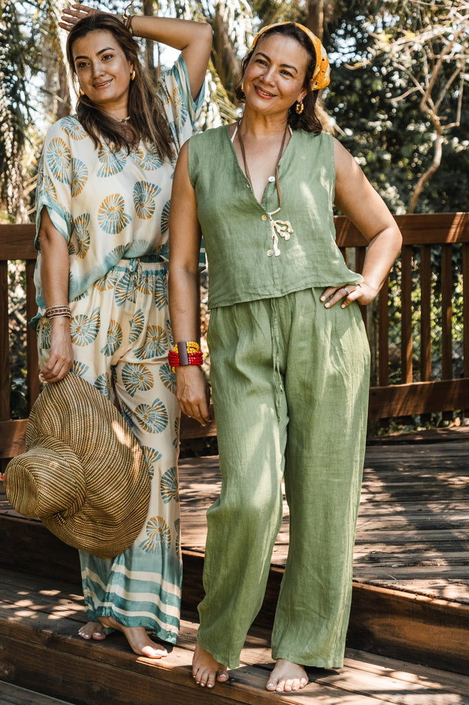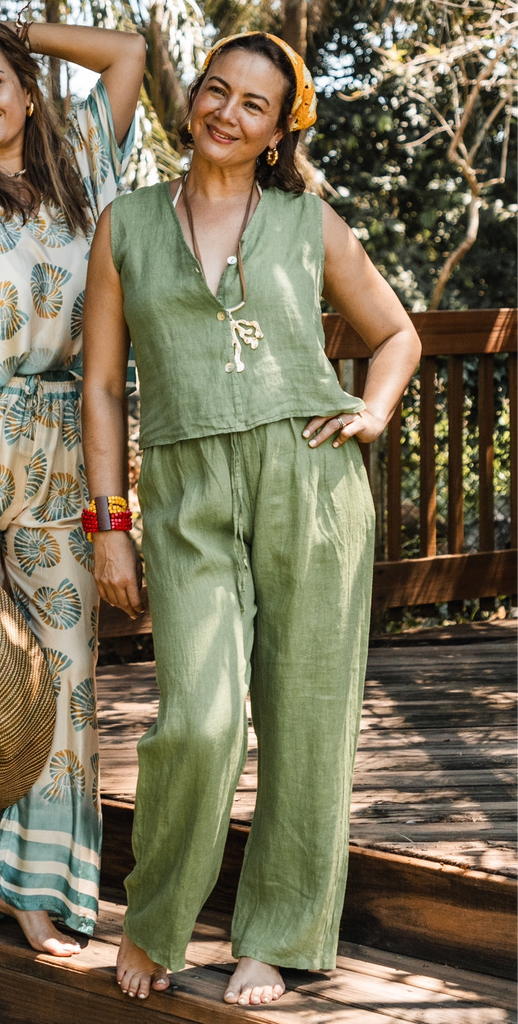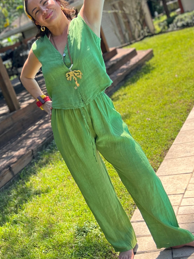 Elastic waisted pants & a stylish vest with buttons, crafted in soft & delicate linen, perfect for all your summer needs.