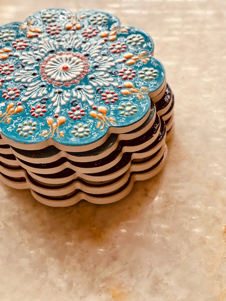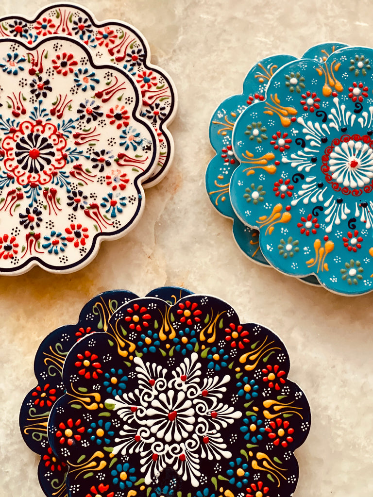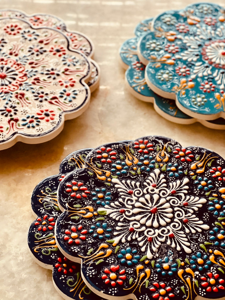 Handmade enameled trivets with cork lining, a beautiful piece of art!