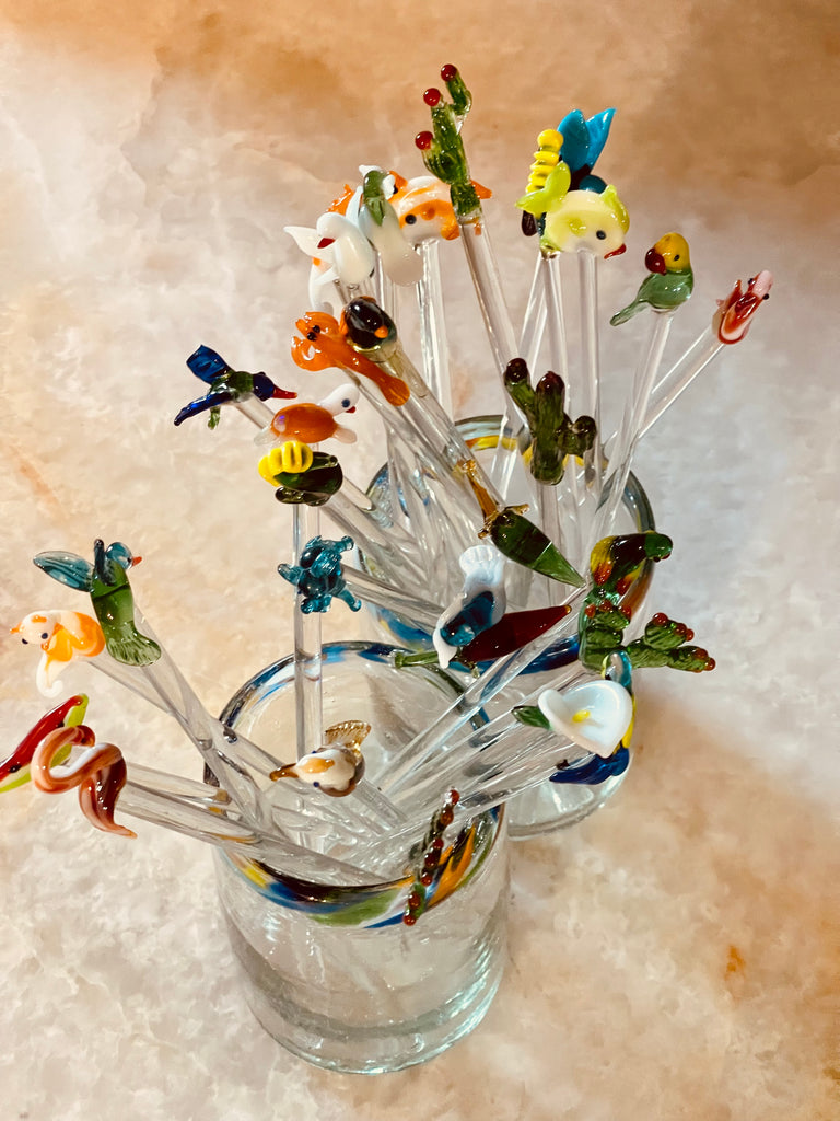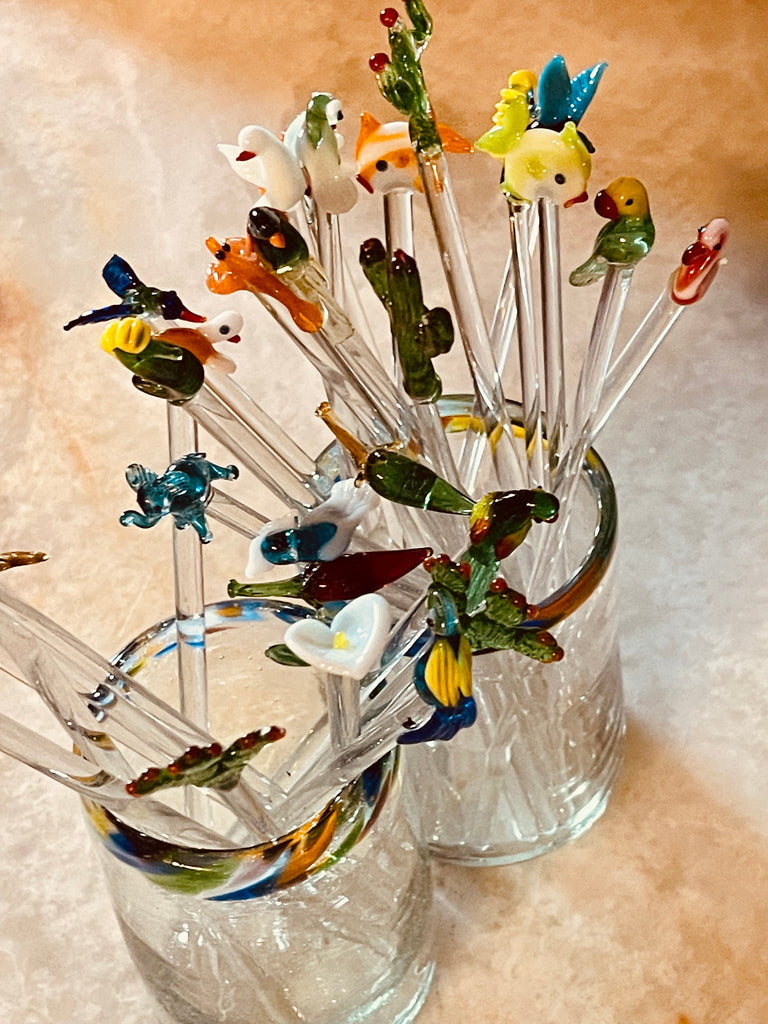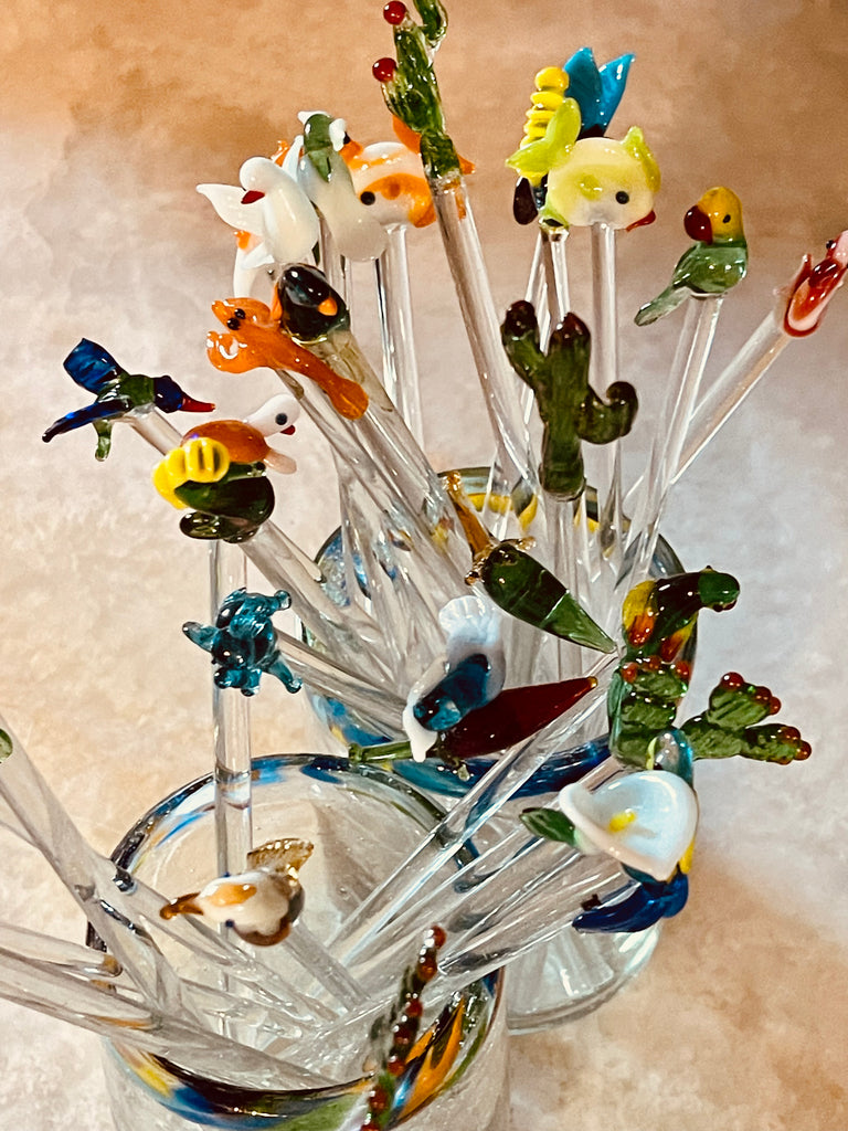 A colorful & beautiful hand blown glass stirrer, crafted by Mexican artisans, entirely by hand. Each piece has a different & unique animal.
