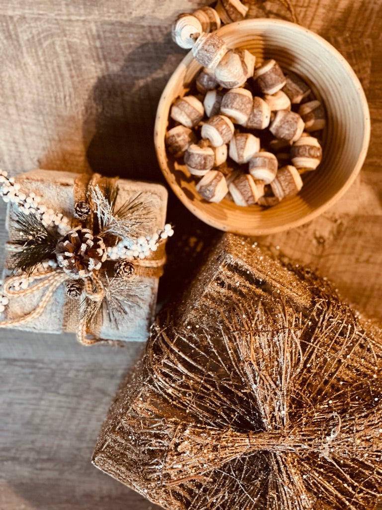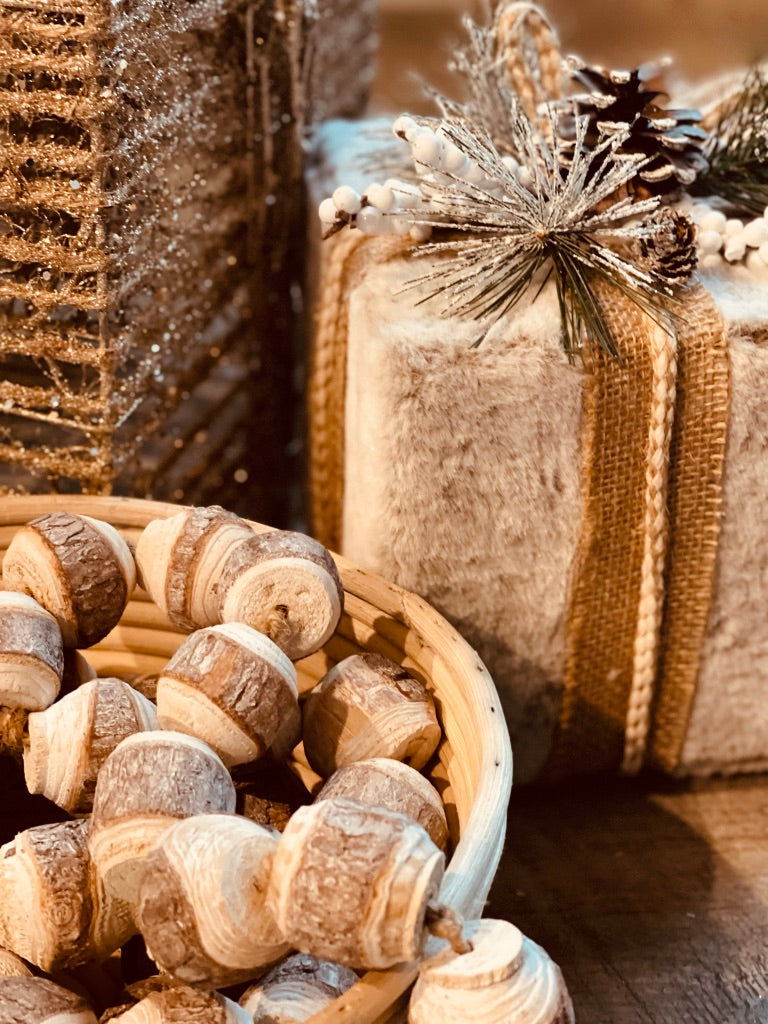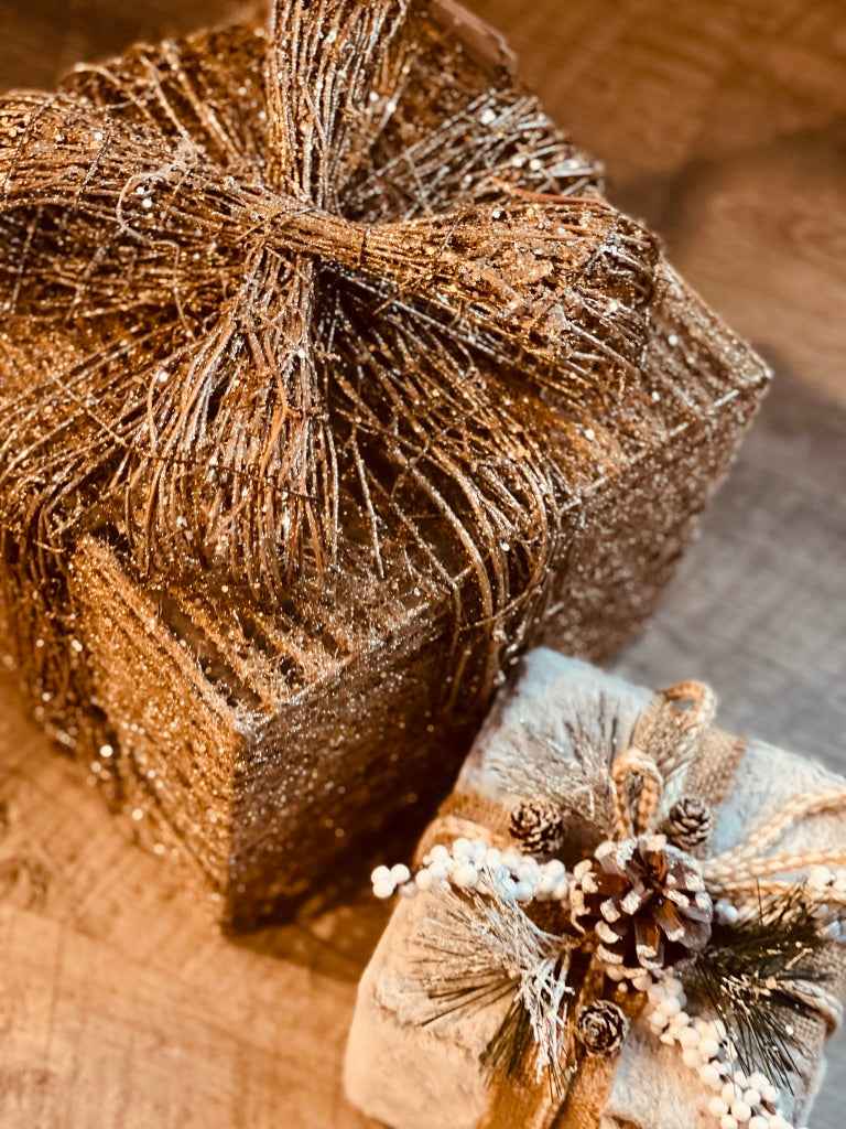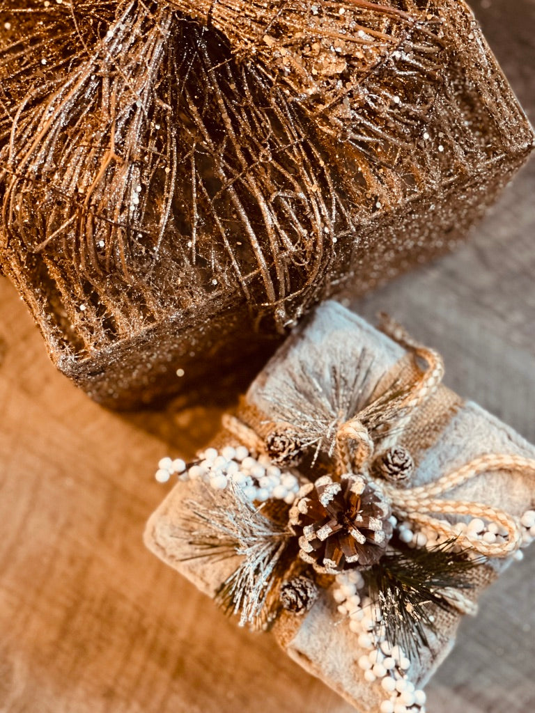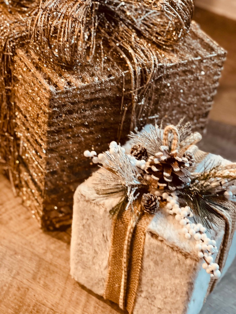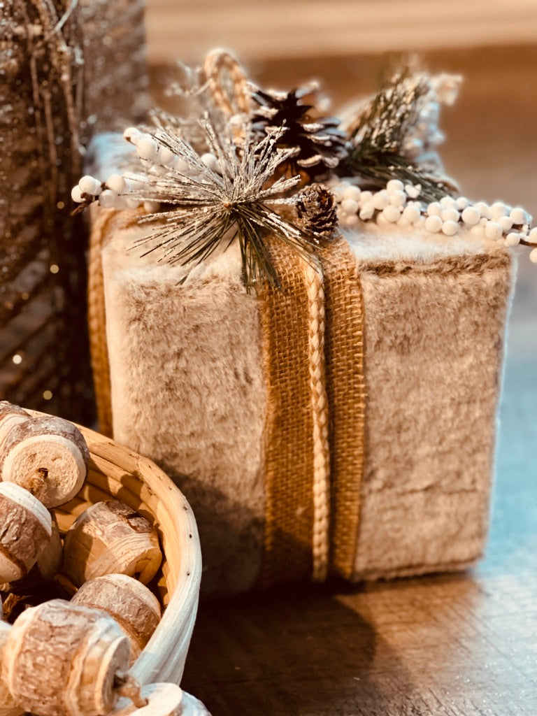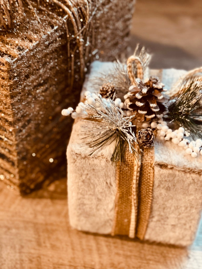 Fluff up your Christmas decor with unique and fuzzy textures provided by this Faux Fur Gift Box Decor. This piece is shaped like a cube present wrapped in soft faux fur. It is wrapped with a burlap ribbon with a beautiful arrangement of frosted pinecones, pine needles, and white berries as the bow.