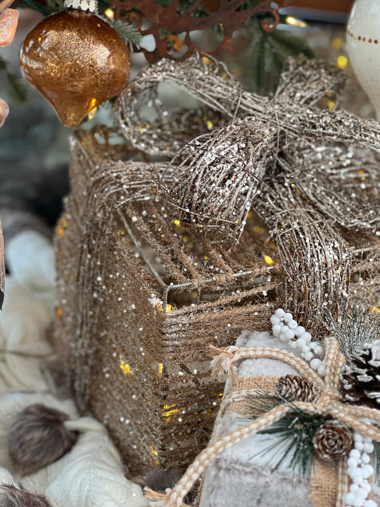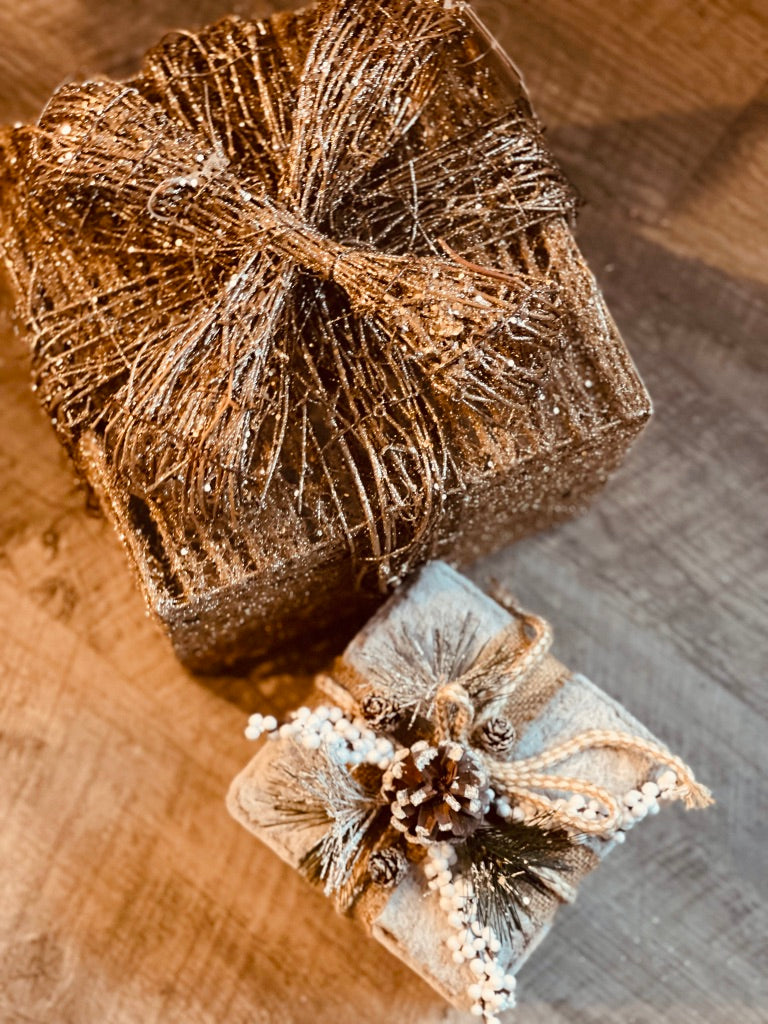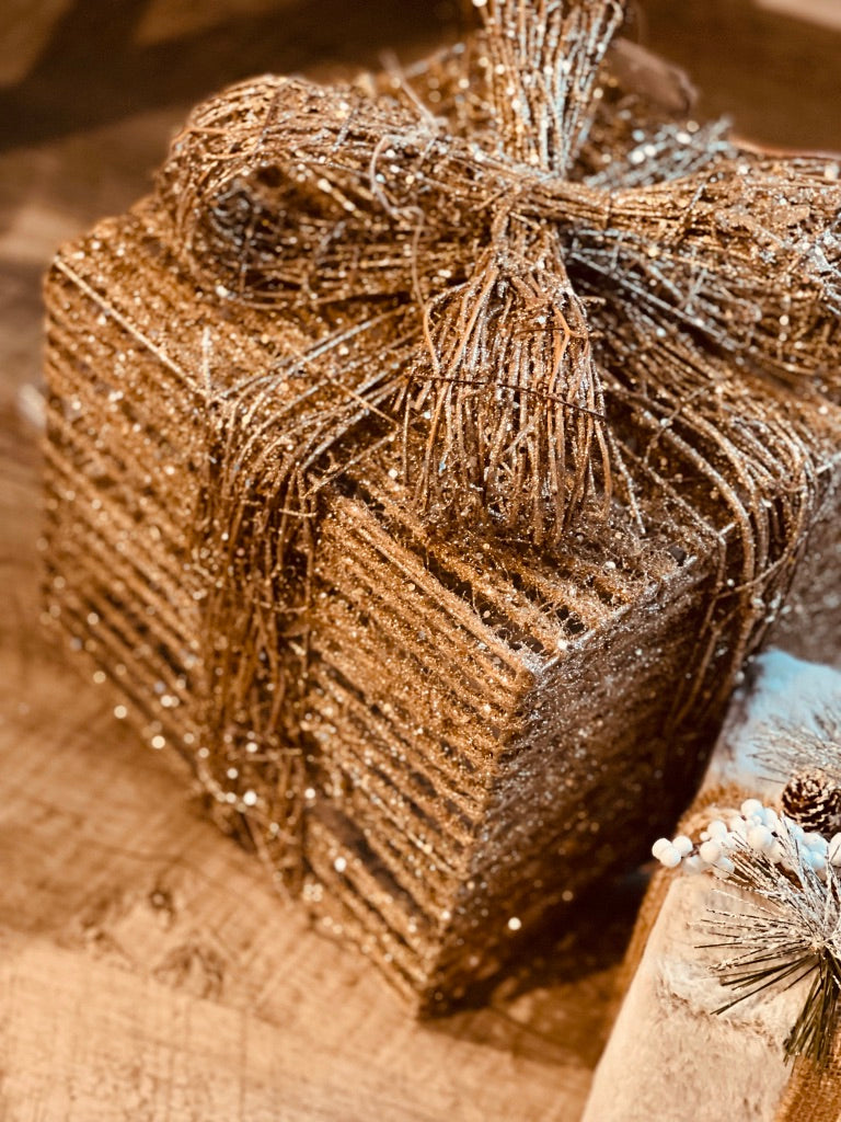 This piece is shaped like a cube, present wrapped in glittered rattan.