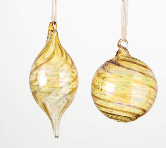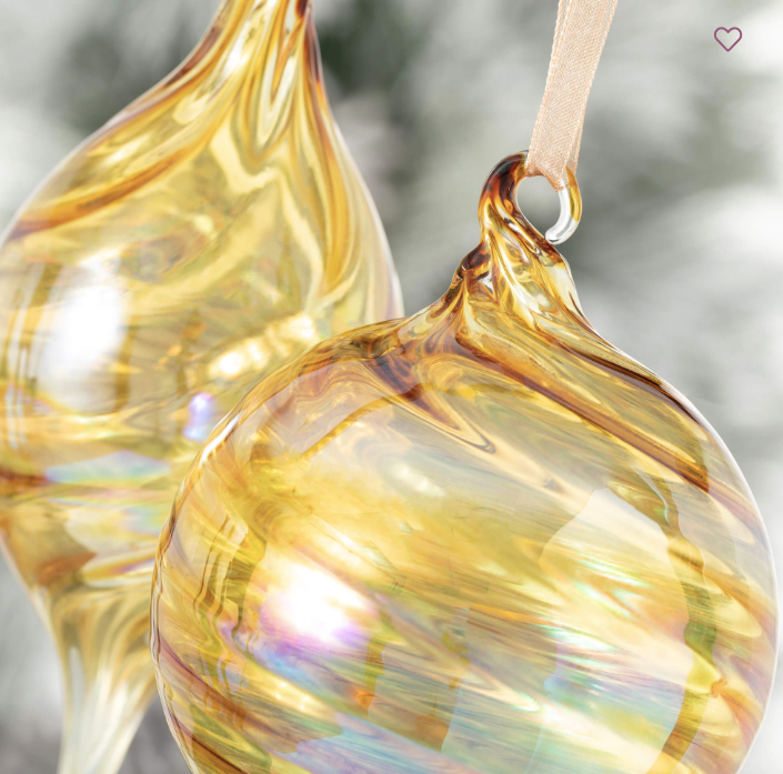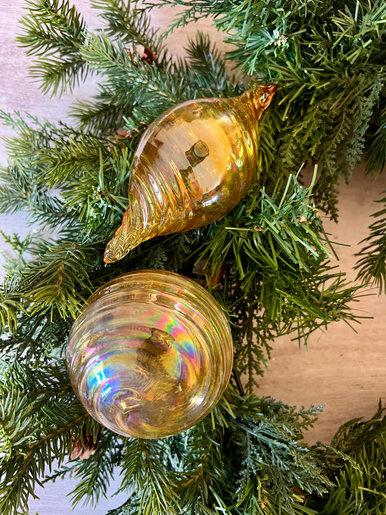 Curvaceous and sophisticated, this lustrous iridescent ball and drop ornament set exudes an earthy appeal with its exclusive amber hue and hand-blown glass. Add some beauty to your Christmas decor this year and for years to come.