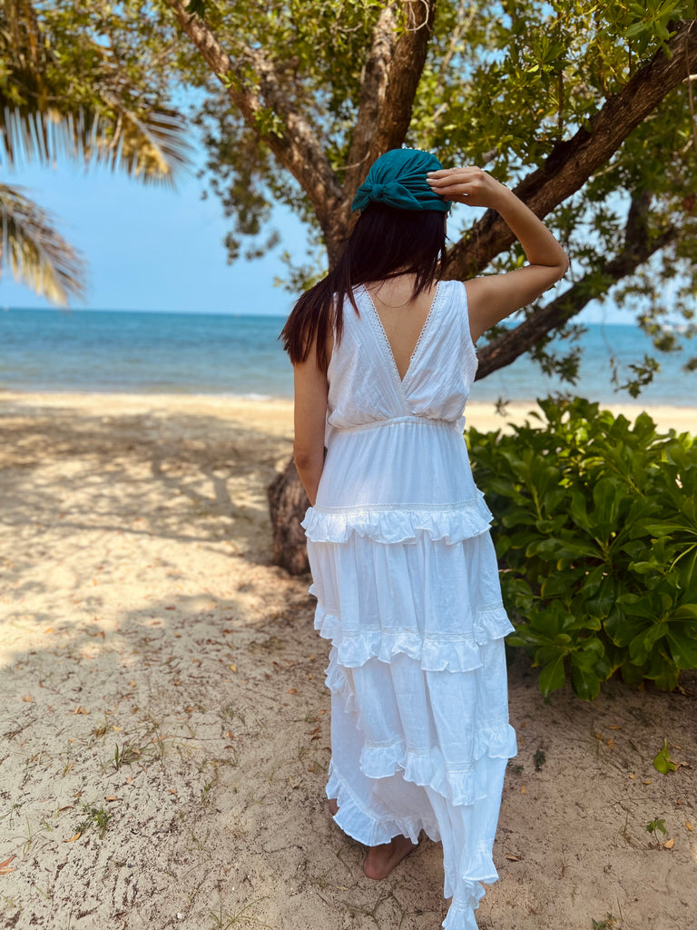 Crisp and pure perfection, mini ruffles with fine hand knitted trim in between.
