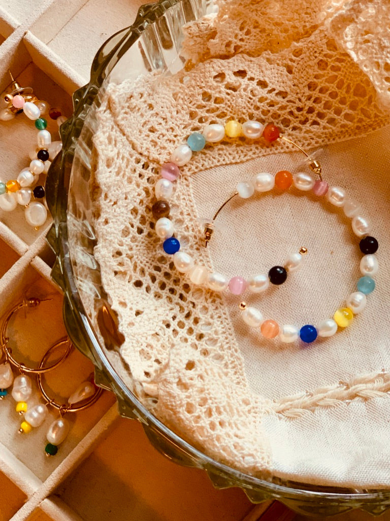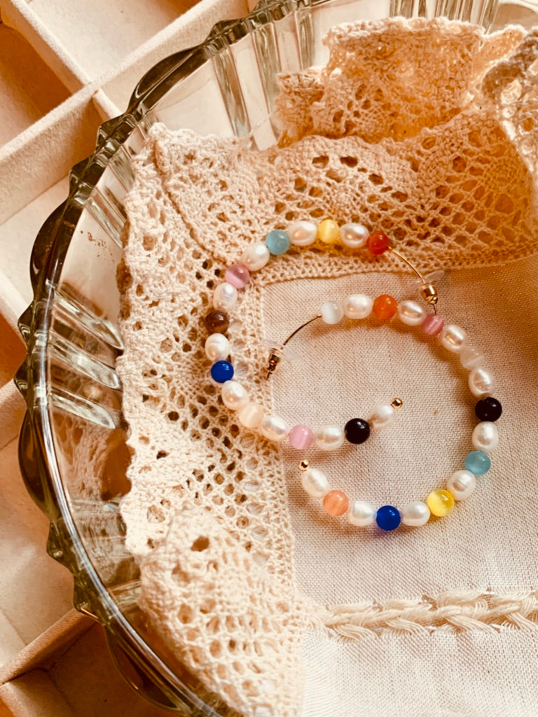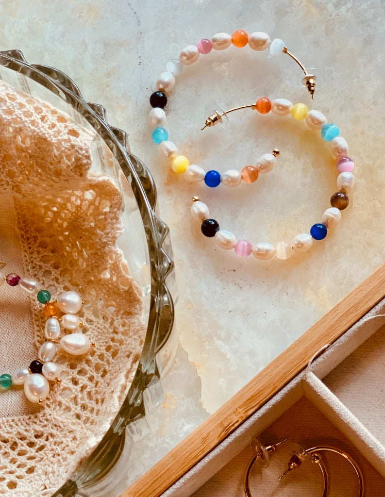 The perfect gold hoop with a hint of color & river pearls, delicately adorning the circle!