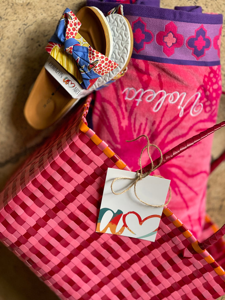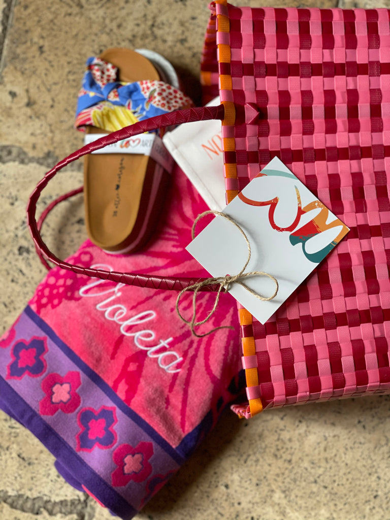 A unique personalized detail, a washable, multipurpose basket filled with a personalized towel and a pair of sandals for the most unique gift!