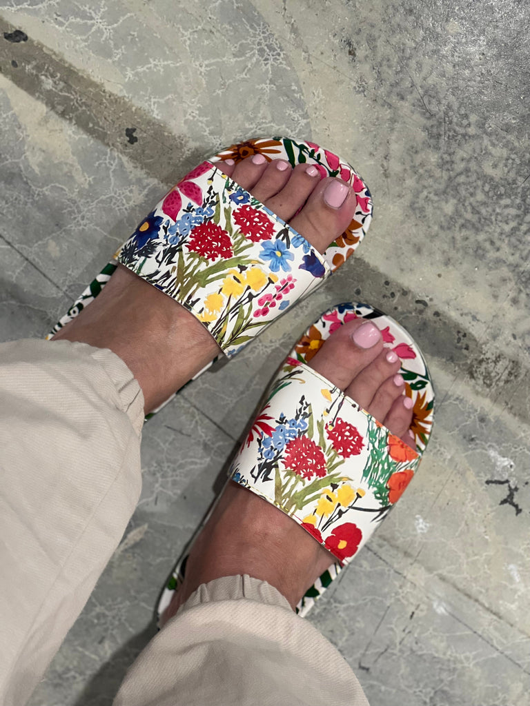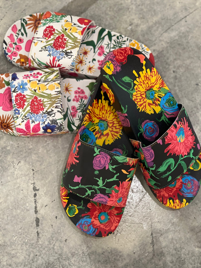 Be stylish and comfortable in our Flower Girl floral printed slides. With a molded footbed and cushioned upper you are sure to run around town in style.
