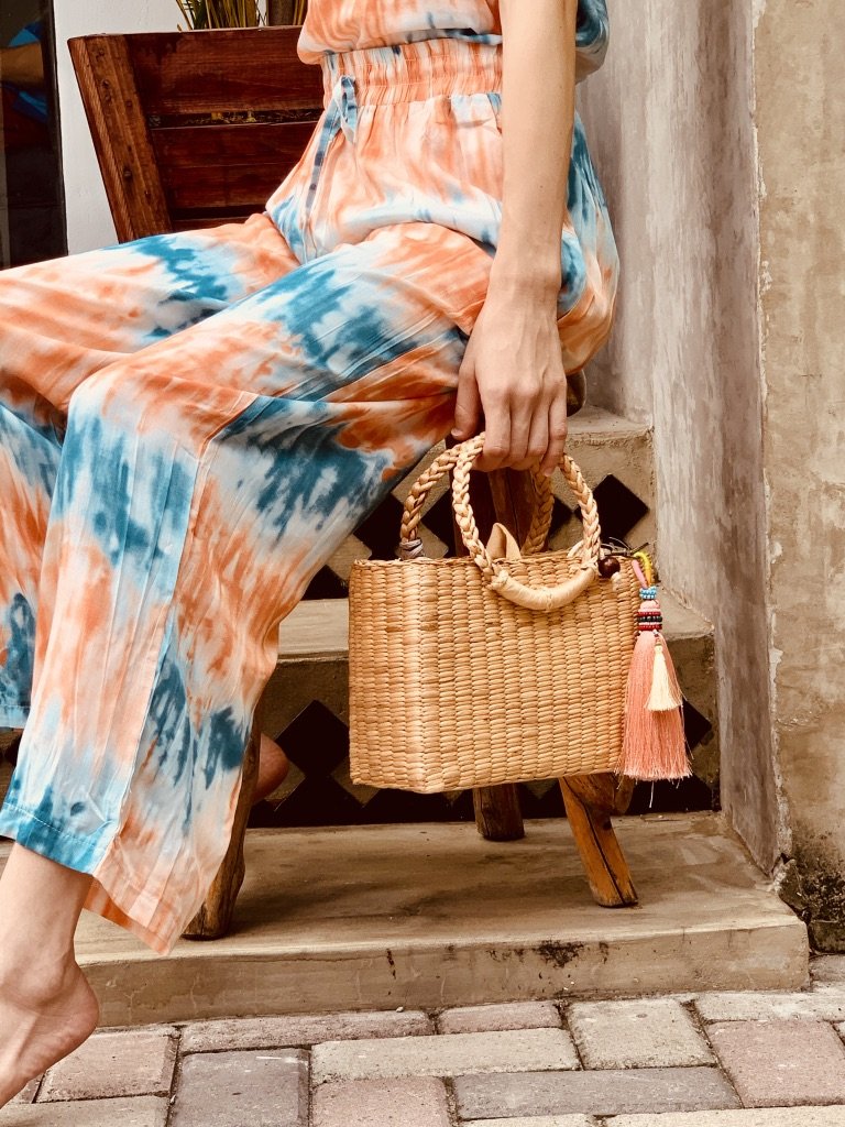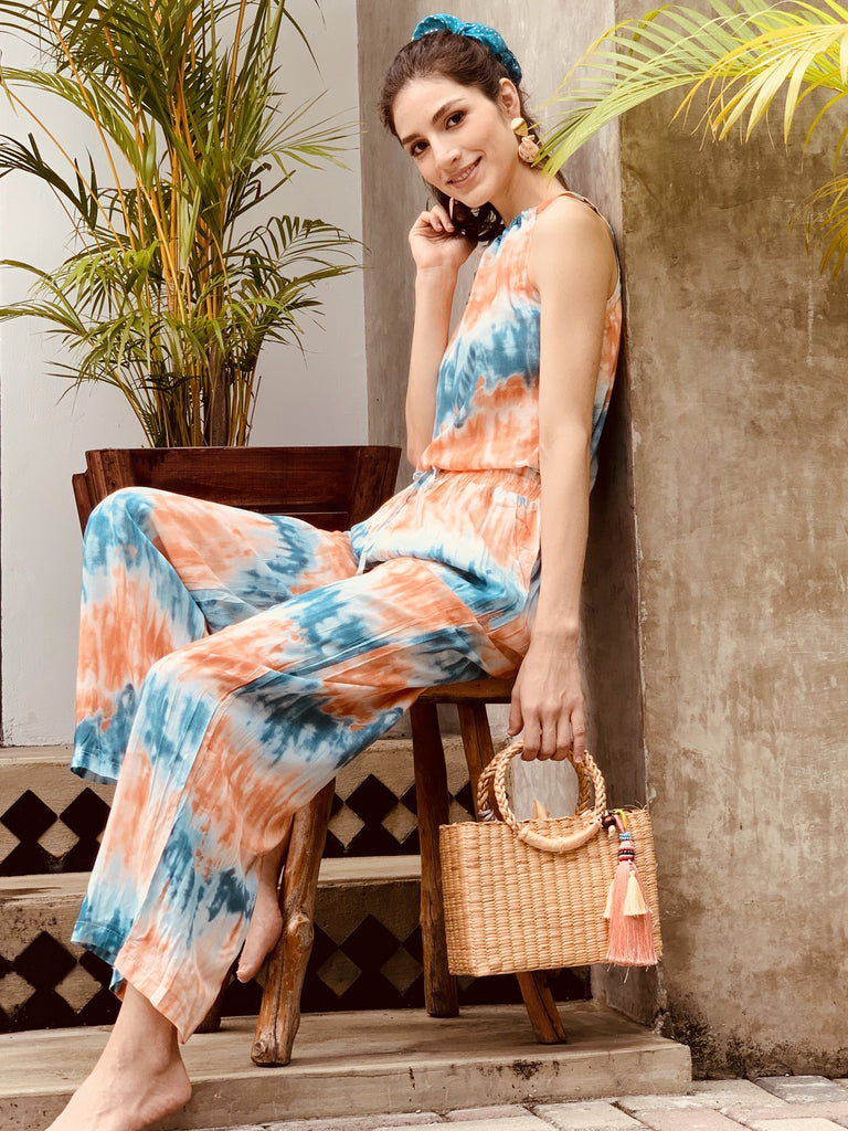 These gorgeous, printed, two piece sets include a tie up sleeveless shirt and elastic waist palazzo pants.