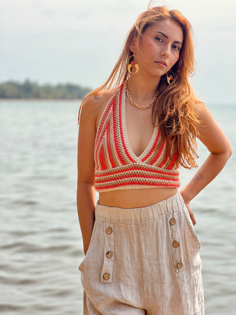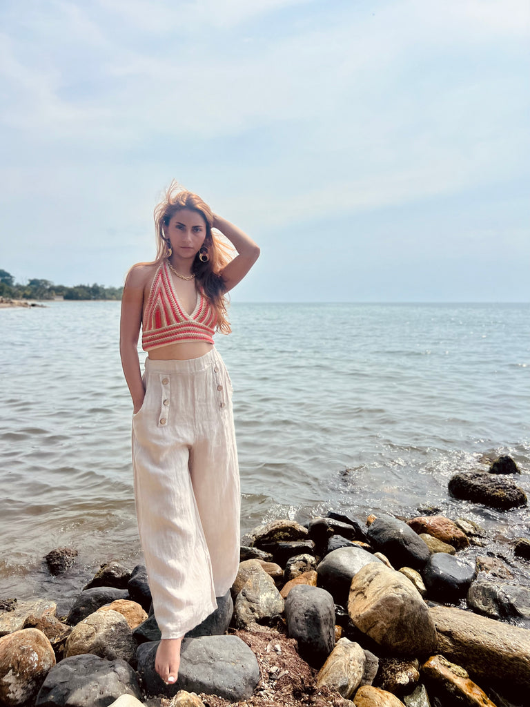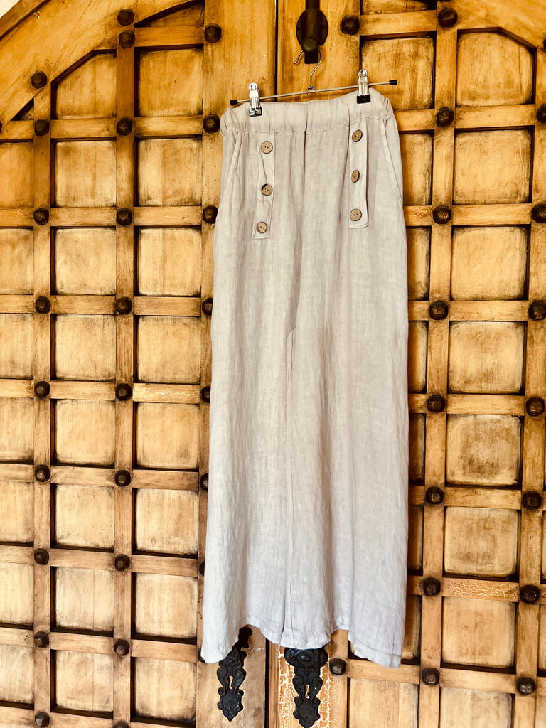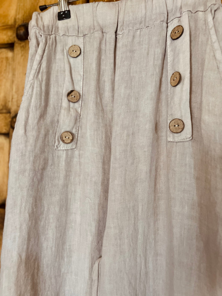 Beautiful & flowy organic linen, detailed with wooden buttons and side pockets, to make them the perfect summer fit, indeed.