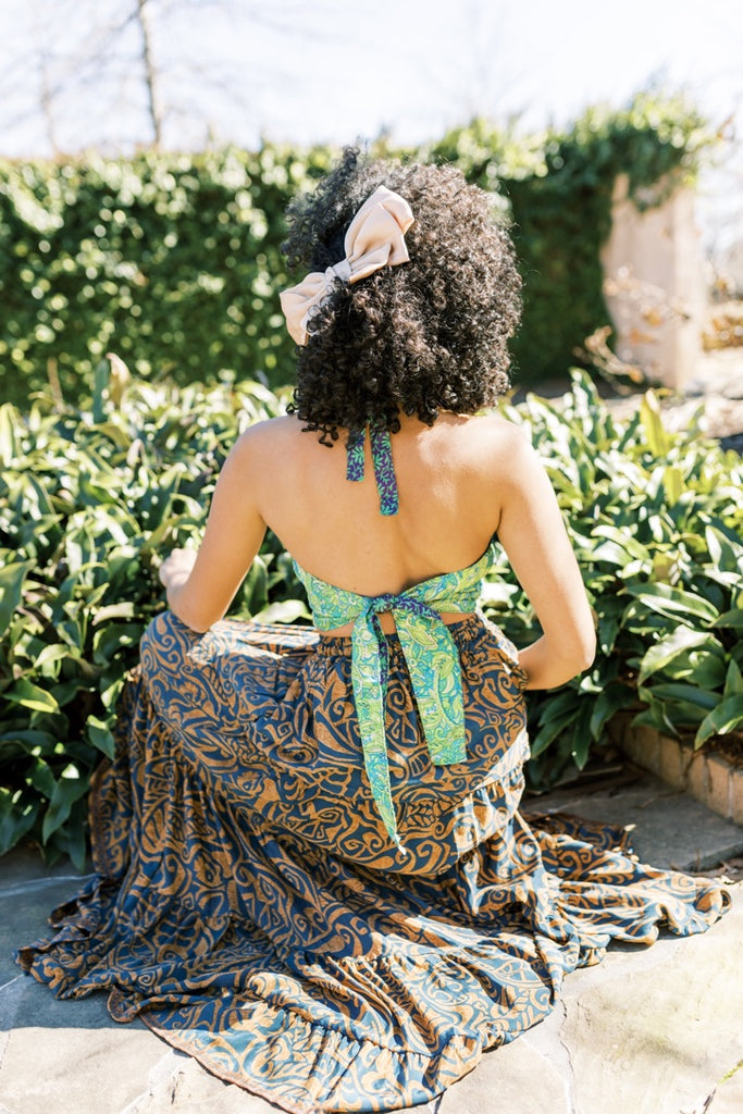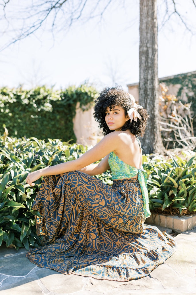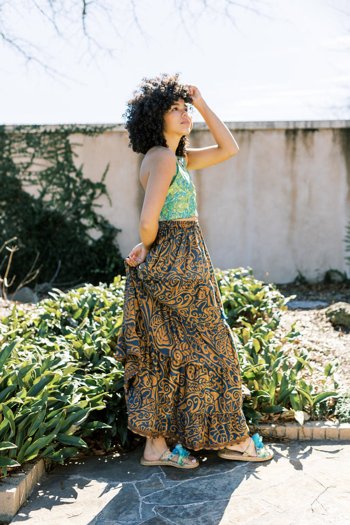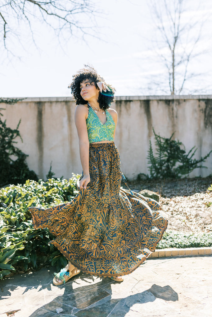 Rich colors in a versatile styled skirt, with a flexible one-size fit, handcrafted in 100% Indian silk.