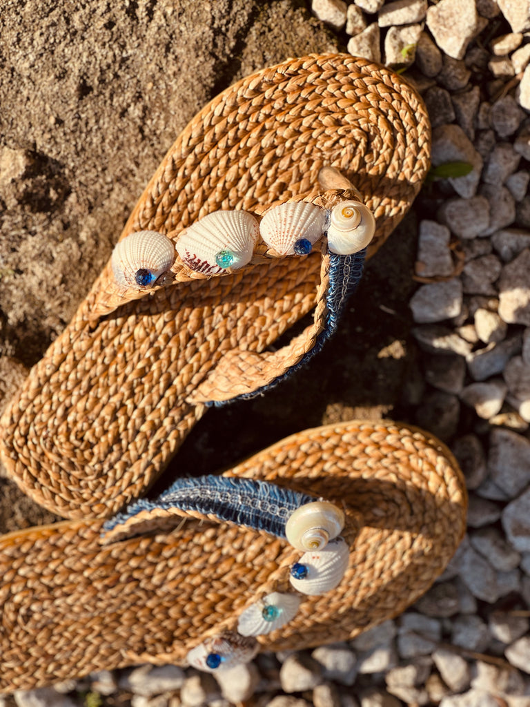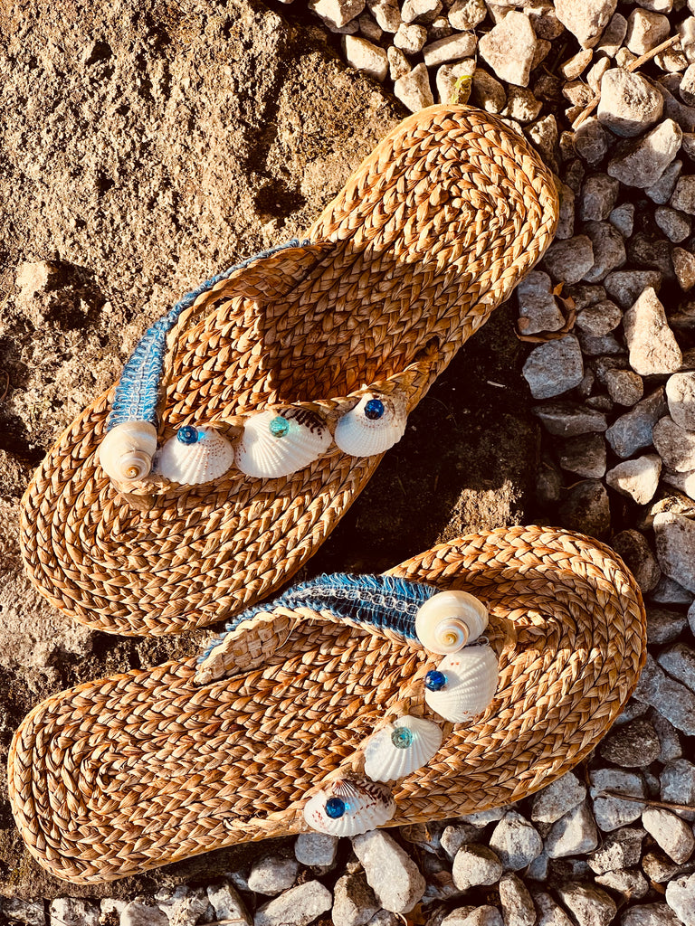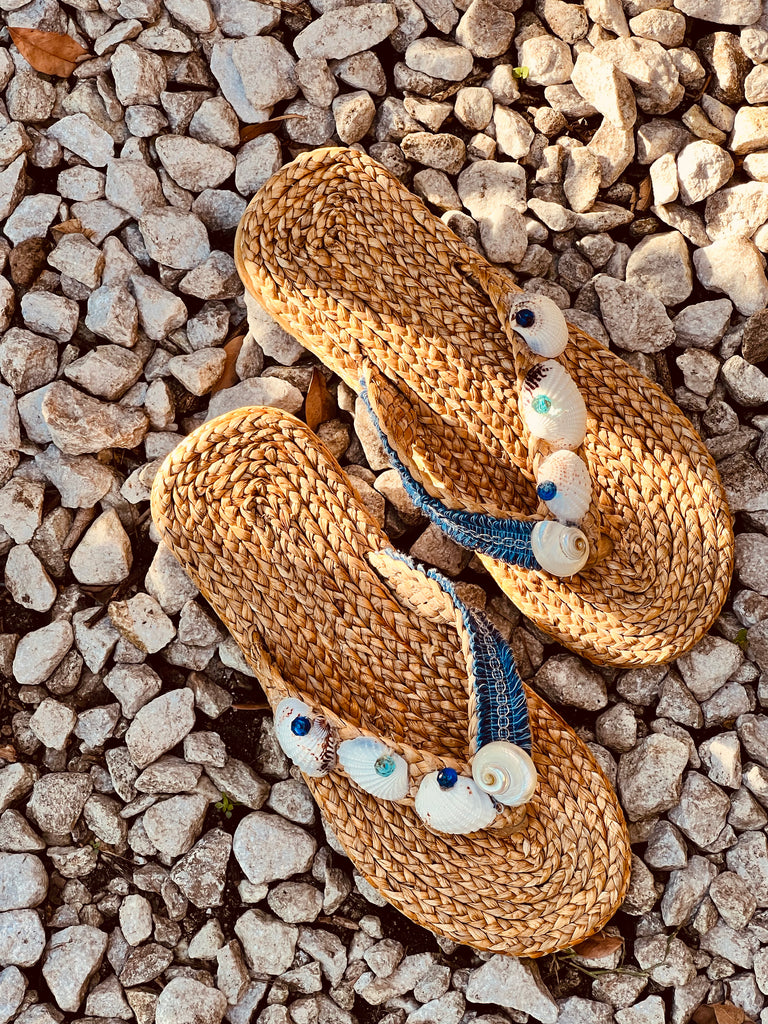 Natural tan, dried seagrass, eco friendly, woven sandals.