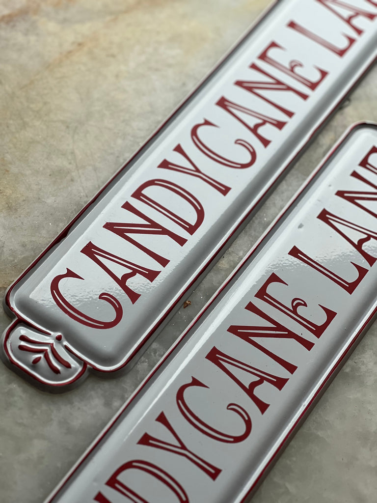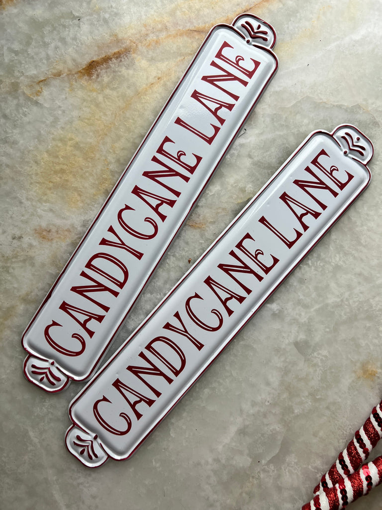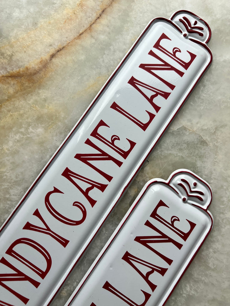 This charming metal sign boasts an ornate rectangular shape with a white background and red trim. In the middle, the words "Candycane Lane" are displayed in a delightful font.