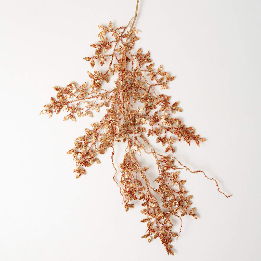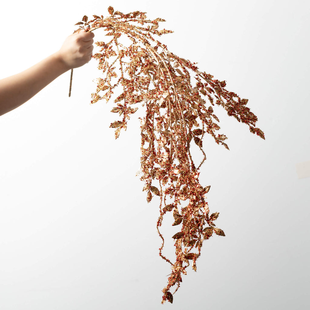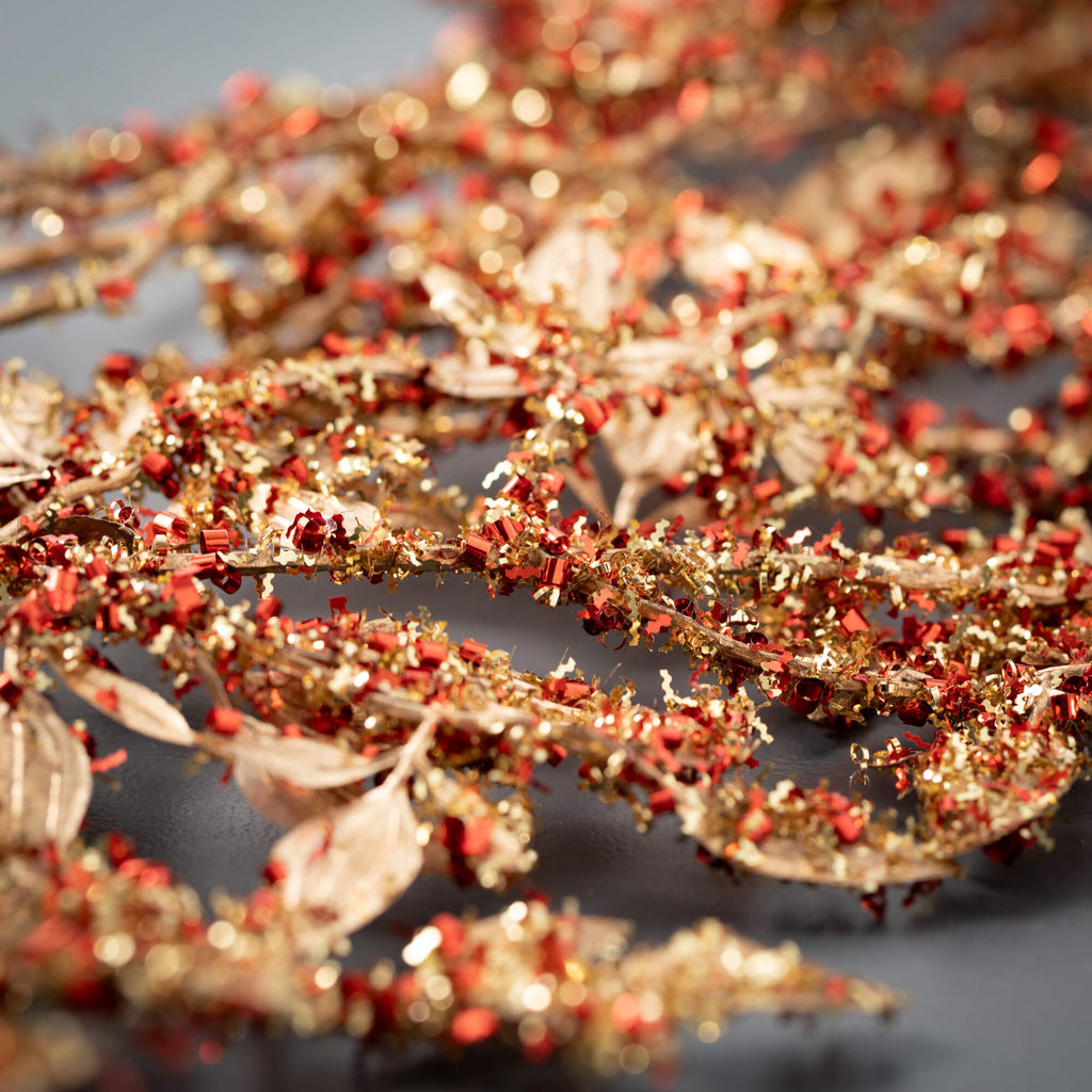 This stylish glitter swag garland adds a showstopping dose of holiday dazzle. Generous in size, its red and gold glitter foliage catch the light from every side. Simply drape this glitter garland over stair railings, mantlepieces or along the edge of a bookshelf for an instant injection of festive glitz and glam. The metallic gold and red hues evoke a sense of luxury and opulence, elevating even the simplest of holiday decorations.