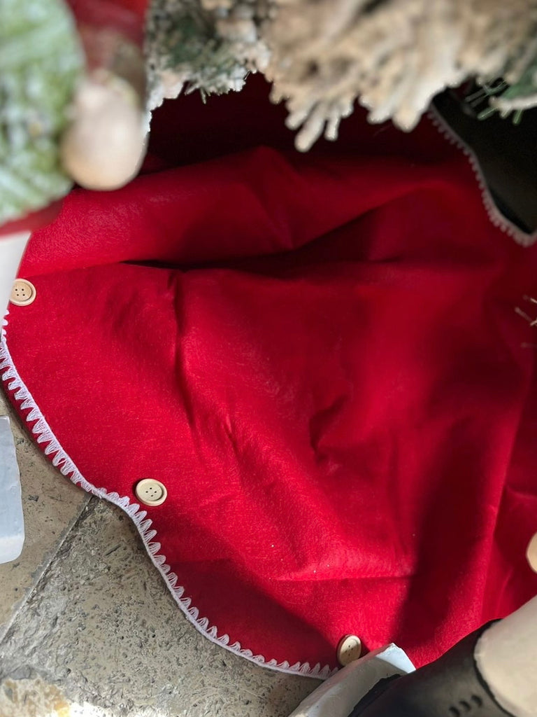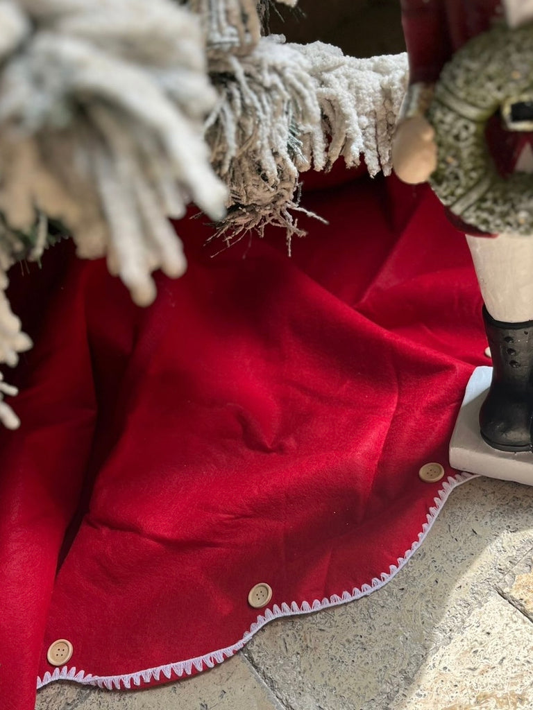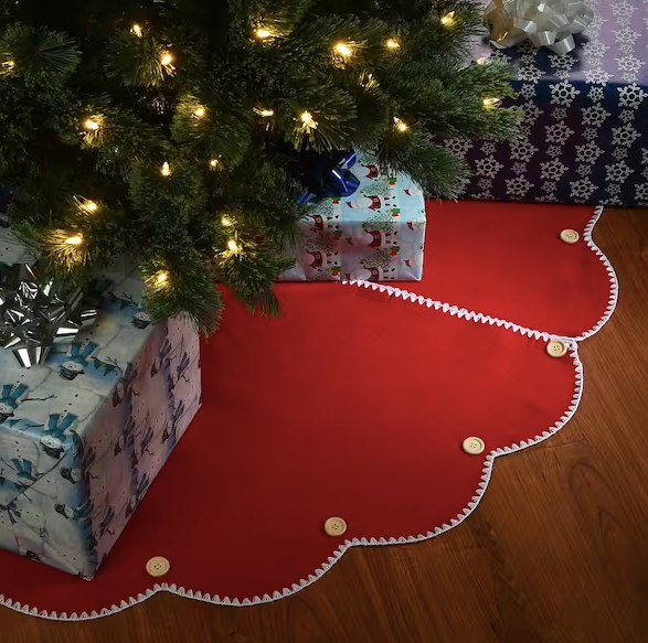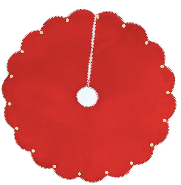 Add the finishing touch by surrounding the base of your Christmas centerpiece with this fun and fancy tree skirt. This skirt features a vibrant red color in a soft scalloped edge pattern. The border is trimmed with decorative white stitching and includes small buttons along the rim to complete the motif. The split seam design allows for easy placement with Velcro tabs included to close and secure the seam.