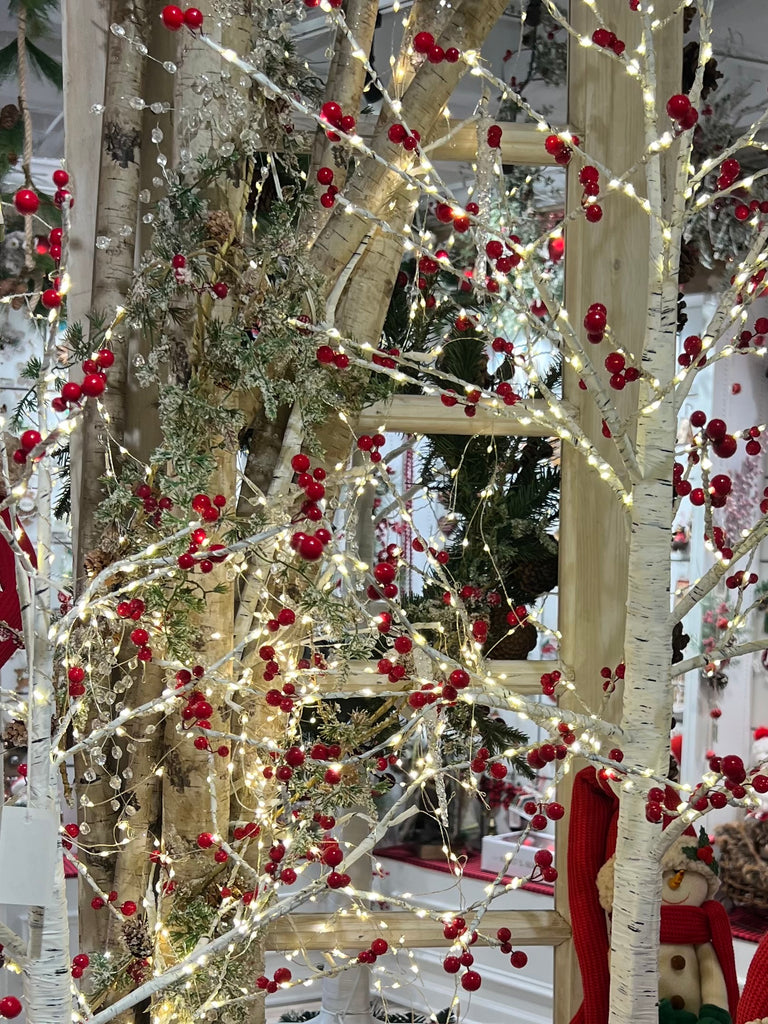 This Red Berry with Branch Fairy LED Twig Tree  is a fun and festive addition to any holiday home décor! This tall tree boasts white birch bark and 240 warm white LED fairy lights and decorated in red berries with a 197" lead wire. The perfect addition to any home or office decor!