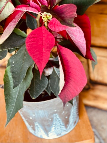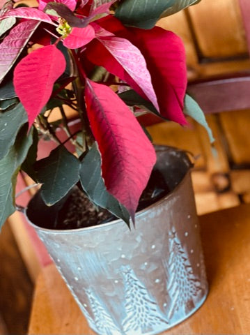 Enjoy this lovely tin canister holder and fresh poinsettias to add a touch of holiday chic to your home.