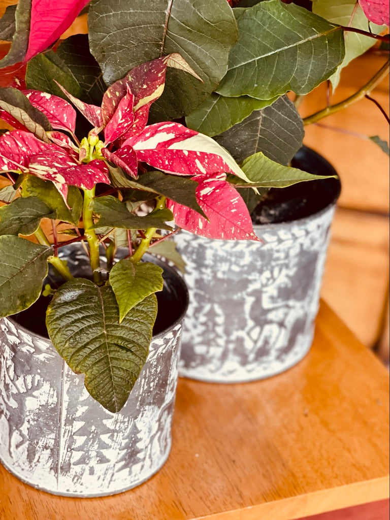 Enjoy this lovely tin canister holder and fresh poinsettias to add a touch of holiday chic to your home.