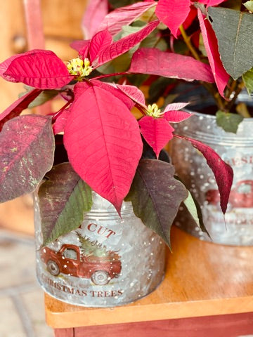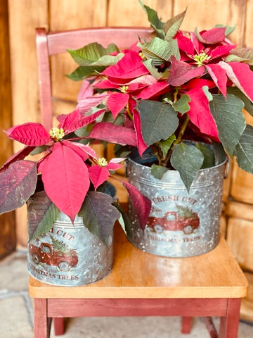 Enjoy this lovely tin canister holder and fresh poinsettias to add a touch of holiday chic to your home.