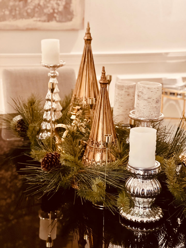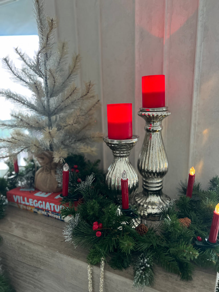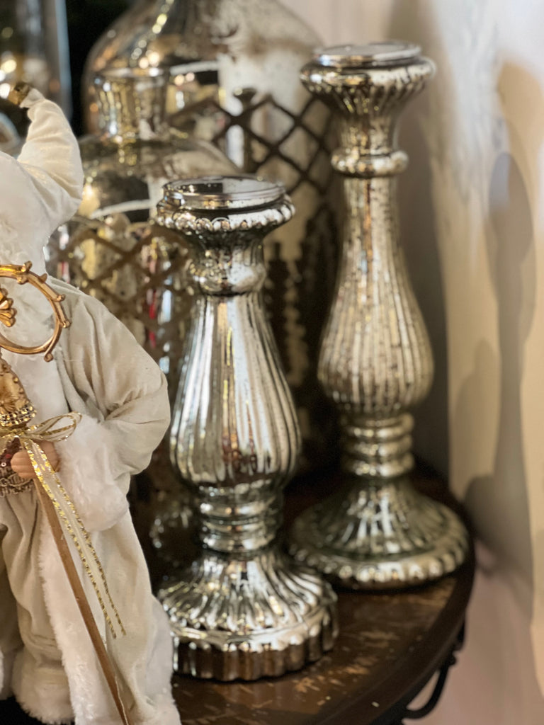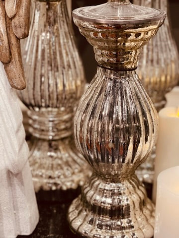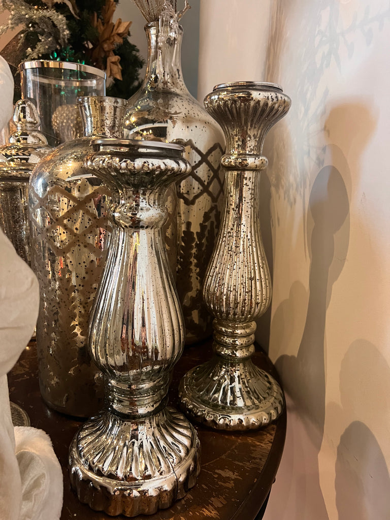 2PC RIBBED SILVER MERCURY GLASS PILLAR CANDLEHOLDER SET