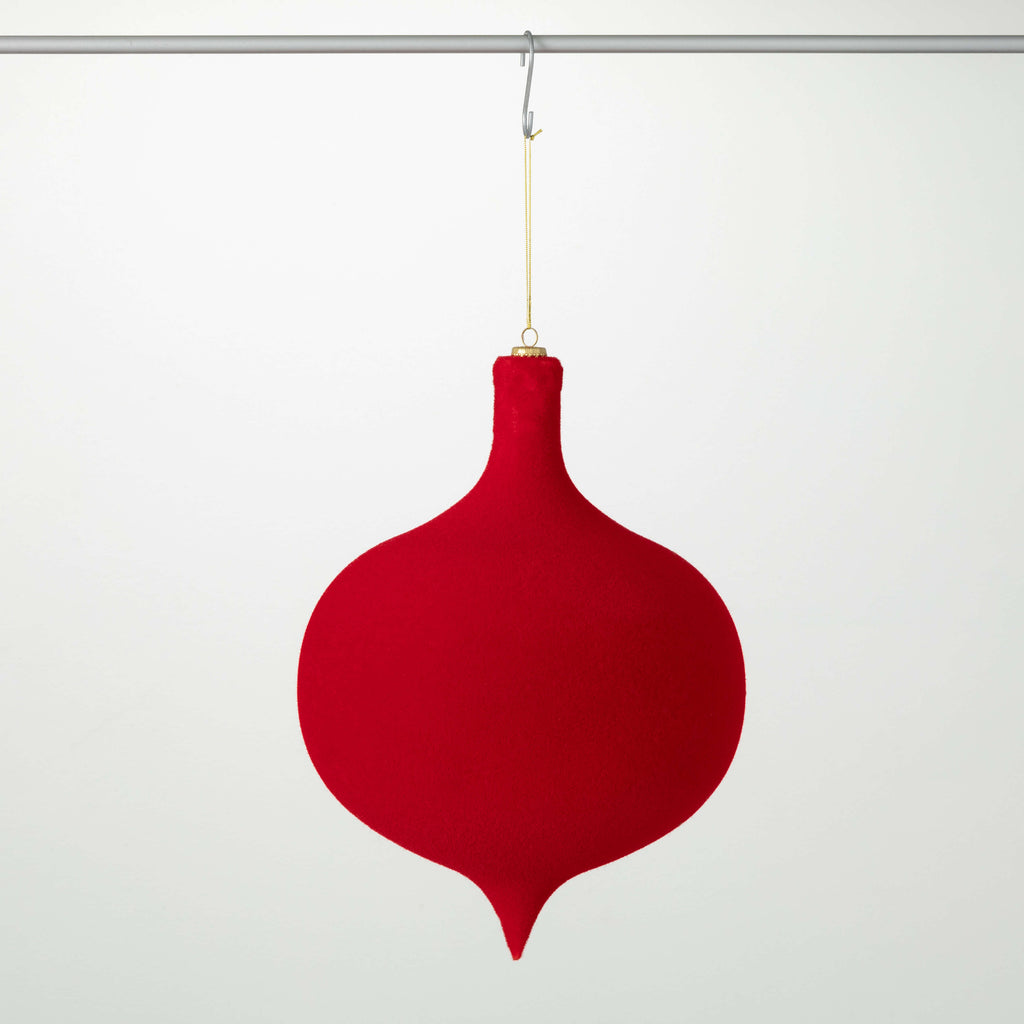 This oversized festive ornament adds a pop of color to your holiday decor. Onion-shaped and flocked with red, it's sure to catch the eye when hanging on your Christmas tree. Simple yet cheerful, this timeless ornament brings a cozy, classic vibe to a tree, front door, or mantel. Just hang it securely and step back to admire the cheerful red dot of color that completes your seasonal display. This ornament is oversized and shatterproof.
