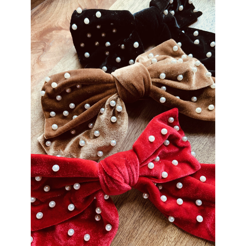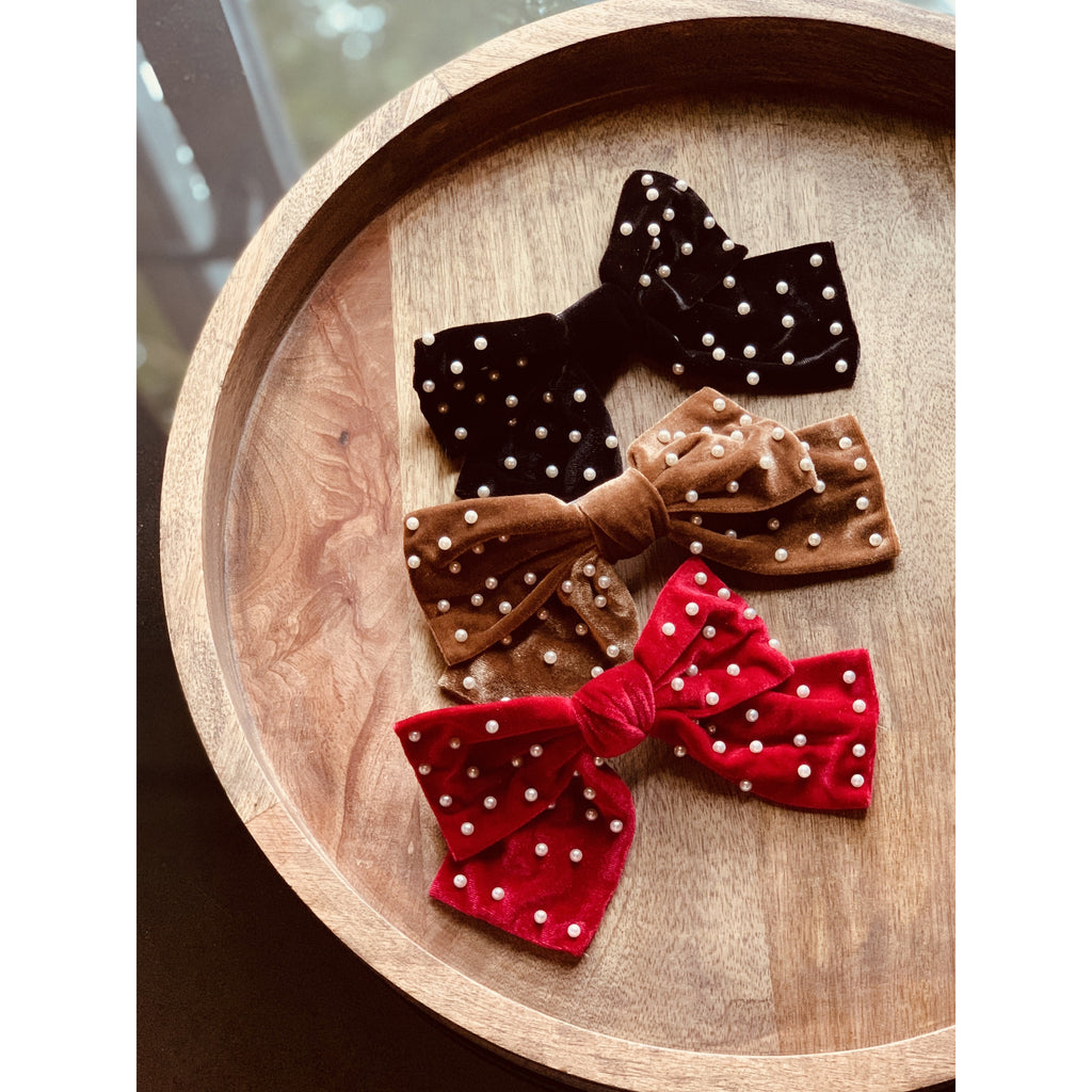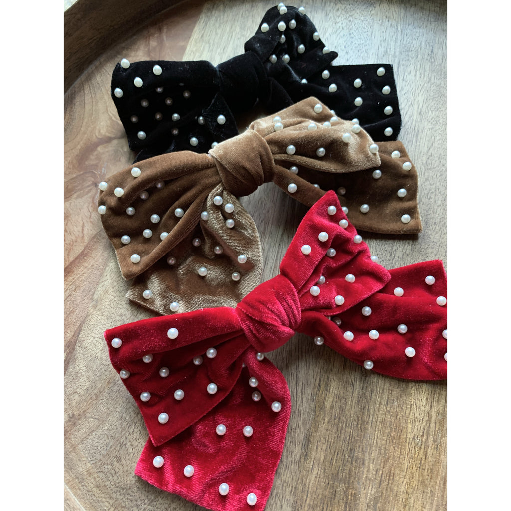 Make a statement with these elegant and chic pearl trimmed velvet bows.