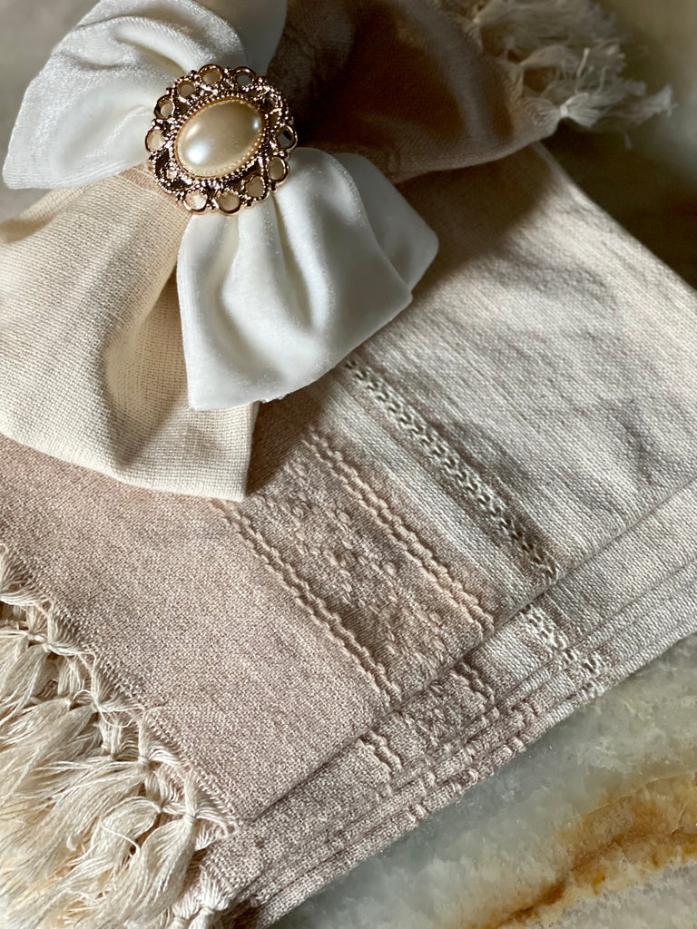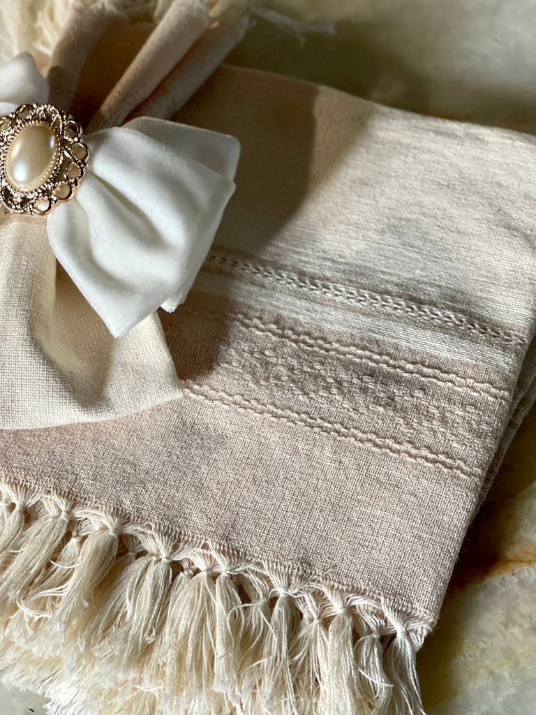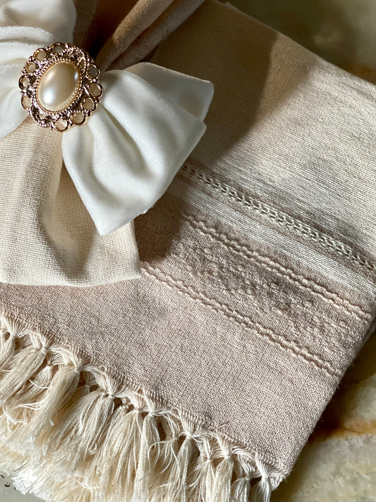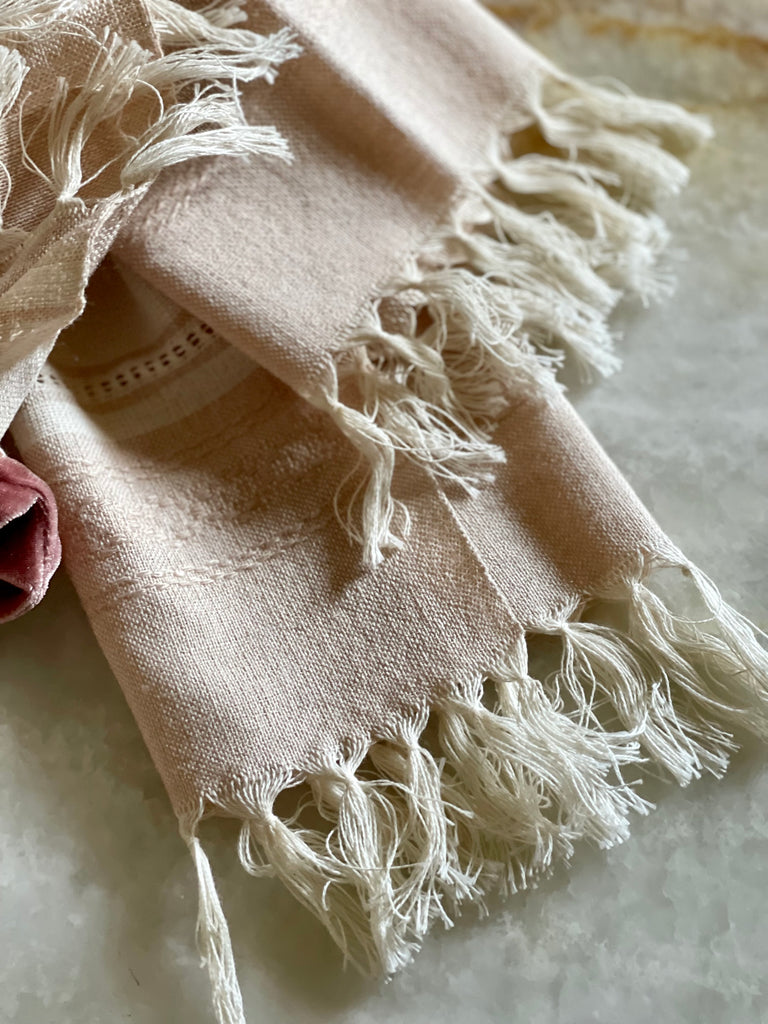 Set includes 6 beautifully handamase, organic cotton, woven napkins and 6 velvet napkin rings.